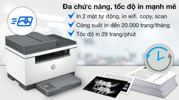 Mỗi phút máy in laser trắng đen xuất ra được 29 trang in, công suất in tối đa trong cả tháng đạt được đến 20.000 trang, cho năng suất công việc cao hơn. Bên cạnh đó, máy trang bị các chức năng in 2 mặt tự động, in Wifi, scan, copy, cho bạn thêm nhiều lựa chọn để xử lý tài liệu phù hợp, tiết kiệm công sức, thời gian.